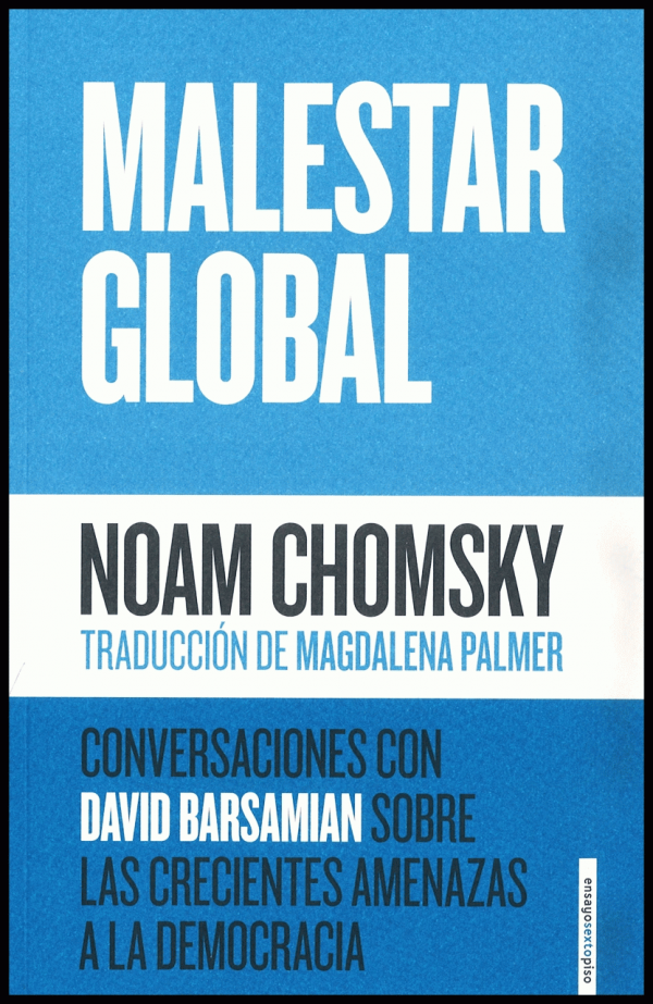 A sus noventa años, Noam Chomsky sigue siendo una de las voces más pertinaces, activas y lúcidas entre los intelectuales de izquierda del mundo contemporáneo. Malestar global reúne doce entrevistas en las que el tenaz activista reflexiona sobre las que considera las problemáticas más acuciantes e impostergables de la esfera internacional, trazando una radiografía puntual, erudita y sin concesiones sobre el mundo que estamos dejando en herencia a nuestros nietos, en riesgo ante amenazas como el cambio climático o la nueva carrera armamentística nuclear. En las entrevistas incluidas en este nuevo libro, Chomsky examina los últimos acontecimientos que tienen lugar alrededor del globo: el ascenso del Estado Islámico, el alcance del Estado policial que se ha instrumentado poco a poco en el ciberespacio, el malestar social ante políticas económicas -como las que emanan de la Troika en Europa- que incrementan la brecha de la desigualdad social, los conflictos en Oriente Medio y, por supuesto, el ascenso de Donald Trump a la presidencia de Estados Unidos. En notas más personales, también aborda su propia infancia en Filadelfia -la relevancia para su formación de una librería de segunda mano en el Nueva York de los años treinta, antes de cumplir los diez años de edad- y su trayectoria hasta convertirse en el disidente número uno de Estados Unidos y del establishment. Dada la incapacidad del sistema de gestionar las amenazas que genera, arguye Chomsky, está en nuestras manos concienciarnos para comenzar un cambio radical a través de los gestos más pequeños y cotidianos.
