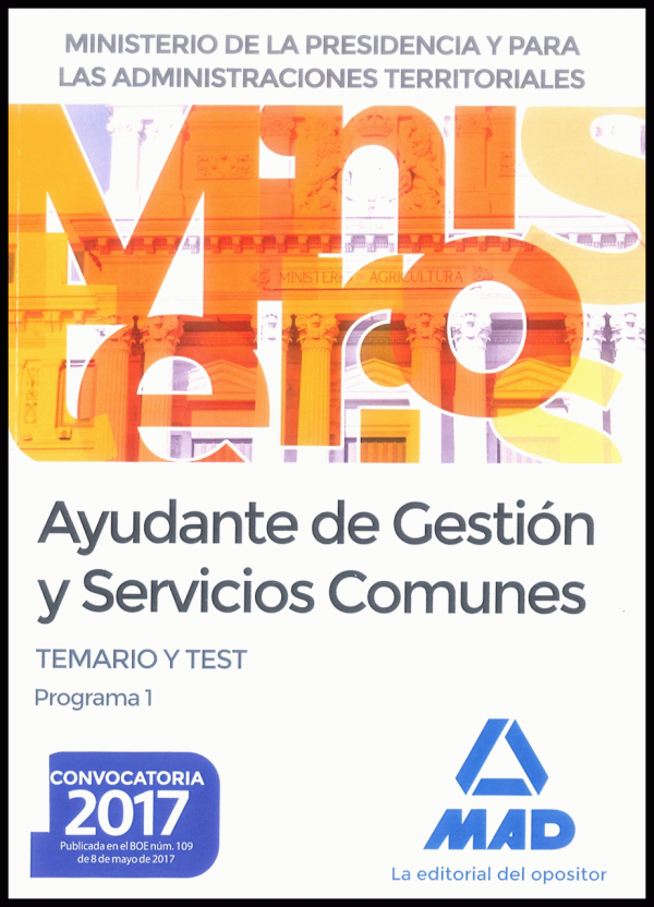 Ayudante de gestión y servicios comunes del Ministerio de la Presidencia y para las Administraciones Territoriales : temario y test programa 1 [autor, Vicente Carlos Morán Alario]