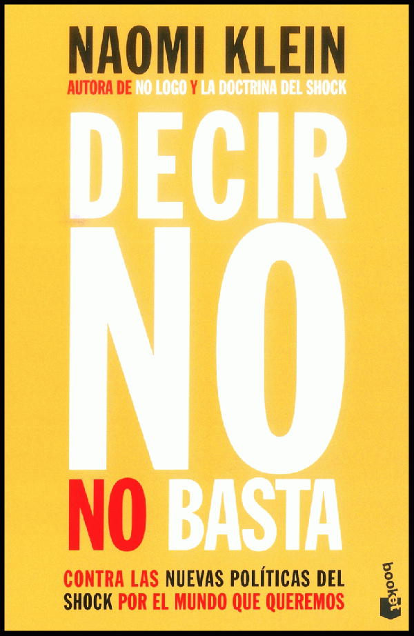 ¿Recuerdan cuando se suponía que el amor iba a triunfar sobre el odio? ¿O que hubo un momento en que las petroleras y los banqueros parecían estar amilanados y a la defensiva? ¿Qué demonios pasó? ¿Y qué podemos hacer al respecto? Naomi Klein nos explica cómo hemos llegado a este punto y cómo podemos cambiar las cosas para mejor. "Decir no no basta" revela, entre otras cosas, que la desorientación que sentimos nos la han provocado deliberadamente. Que por todo el mundo, para generar una crisis tras otra, se están utilizando tácticas de shock diseñadas para forzar políticas que van a arruinar a la gente, el medio ambiente, la economía y nuestra seguridad. Que el extremismo no es un hecho aberrante, sino un cóctel tóxico de nuestros tiempos. Naomi Klein nos enseña cómo podemos romper el hechizo y conseguir el mundo que necesitamos. No dejemos que se salgan con la suya.