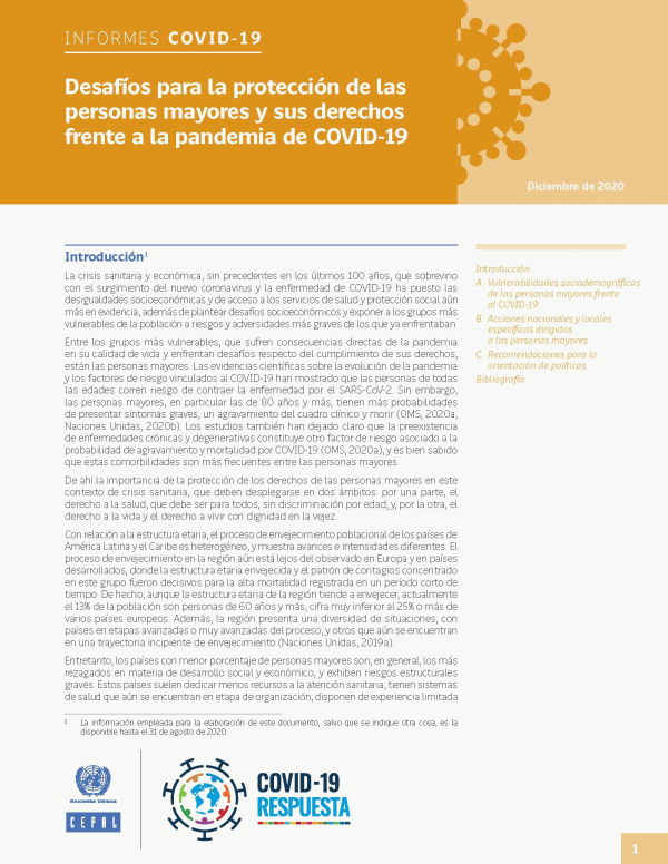 La crisis sanitaria y económica, sin precedentes en los últimos 100 años, que sobrevino con el surgimiento del nuevo coronavirus y la enfermedad de COVID-19 ha puesto las desigualdades socioeconómicas y de acceso a los servicios de salud y protección social aún más en evidencia, además de plantear desafíos socioeconómicos y exponer a los grupos más vulnerables de la población a riesgos y adversidades más graves de los que ya enfrentaban. Entre los grupos más vulnerables, que sufren consecuencias directas de la pandemia en su calidad de vida y enfrentan desafíos respecto del cumplimiento de sus derechos, están las personas mayores. Las evidencias científicas sobre la evolución de la pandemia y los factores de riesgo vinculados al COVID-19 han mostrado que las personas de todas las edades corren riesgo de contraer la enfermedad por el SARS-CoV-2. Sin embargo, las personas mayores, en particular las de 80 años y más, tienen más probabilidades de presentar síntomas graves, un agravamiento del cuadro clínico y morir. Los estudios también han dejado claro que la preexistencia de enfermedades crónicas y degenerativas constituye otro factor de riesgo asociado a la probabilidad de agravamiento y mortalidad por COVID-19, y es bien sabido que estas comorbilidades son más frecuentes entre las personas mayores. De ahí la importancia de la protección de los derechos de las personas mayores en este contexto de crisis sanitaria, que deben desplegarse en dos ámbitos: por una parte, el derecho a la salud, que debe ser para todos, sin discriminación por edad, y, por la otra, el derecho a la vida y el derecho a vivir con dignidad en la vejez.