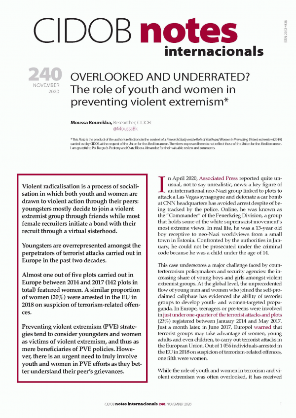 Overlooked and underrated? [Recurso electrónico] : the role of youth and women in preventing violent extremism Moussa Bourekba