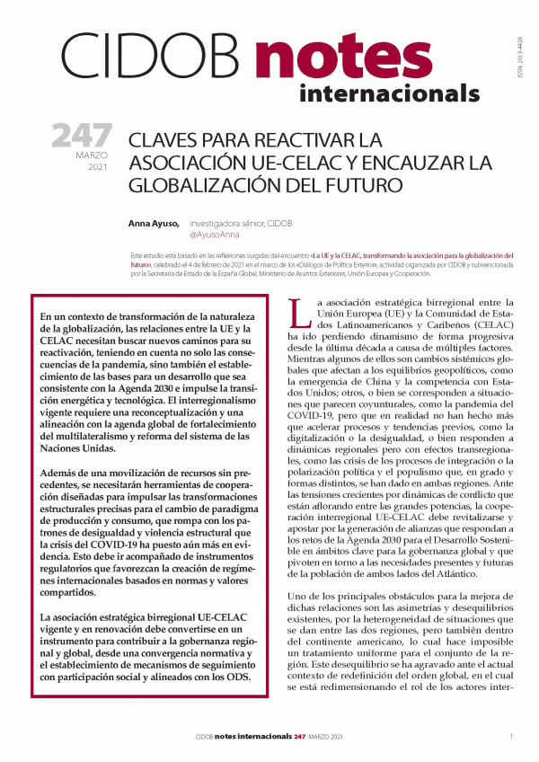 Este estudio está basado en las reflexiones surgidas del encuentro «La UE y la CELAC, transformando la asociación para la globalización del futuro», celebrado el 4 de febrero de 2021 en el marco de los «Diálogos de Política Exterior», actividad organizada por CIDOB y subvencionada por la Secretaría de Estado de la España Global, Ministerio de Asuntos Exteriores, Unión Europea y Cooperació