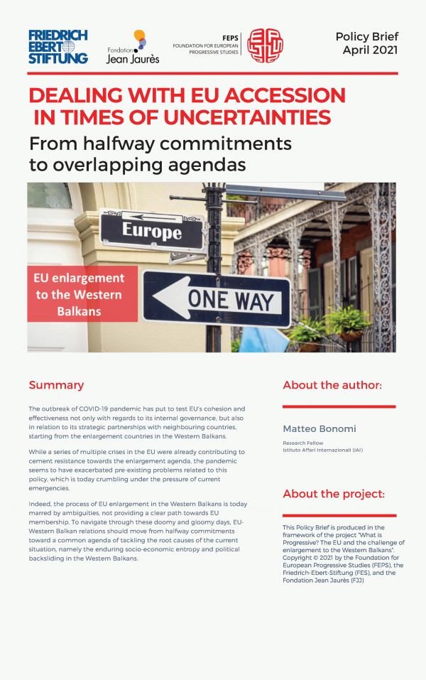 TextoSeries Police Brief ; April 2021Detalles de publicación: Brussels : Foundation for European Progressive Studies ; Paris : Fondation Jean Jaurès ; Rome : Friedrich-Ebert-Stiftung Italy Office , 2021Descripción: 6 pTema(s): Recursos en línea: Resumen: The outbreak of COVID-19 pandemic has put to test EU's cohesion and effectiveness not only with regards to its internal governance, but alsoin relation to its strategic partnerships with neighbouring countries, starting from the enlargement countries in the Western Balkans. While a series of multiple crises in the EU were already contributing tocement resistance towards the enlargement agenda, the pandemic seems to have exacerbated pre-existing problems related to this policy, which is today crumbling under the pressure of current emergencies. Indeed, the process of EU enlargement in the Western Balkans is today marred by ambiguities, not providing a clear path towards EUmembership. To navigate through these doomy and gloomy days, EU-Western Balkan relations should move from halfway commitments toward a common agenda of tackling the root causes of the current situation, namely the enduring socio-economic entropy and political backsliding in the Western Balkans.