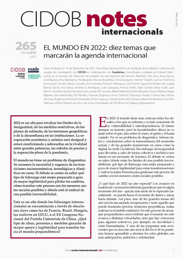 "Texto finalizado el 14 de diciembre de 2021. Esta Nota Internacional es el resultado de la reflexión colectiva del equipo de investigación de CIDOB en colaboración con EsadeGeo. Coordinada y editada por Eduard Soler i Lecha, en el proceso de redacción ha contado con aportaciones de Hannah Abdullah, Inés Arco, Anna Ayuso, Jordi Bacaria, Ana Ballesteros, Pol Bargués, Moussa Bourekba, Anna Busquets, Carmen Claudín, Carme Colomina, Emmanuel Comte, Carlota Cumella, Anna Estrada, Francesc Fàbregues, Oriol Farrés, Agustí Fernández de Losada, Blanca Garcés, Eva Garcia, Andrea G. Rodríguez, Juan Garrigues, Francis Ghilès, Seán Golden, Berta Güell, Juan Ramón Jiménez-García, Francesca Leso, Josep Mª Lloveras, Rafael Martínez, Esther Masclans, Óscar Mateos, Sergio Maydeu, Elisa Menéndez, Pol Morillas, Yolanda Onghena, Umut Özkirimli, Francesco Pasetti, Cristina Sala, Héctor Sánchez, Ángel Saz, Reinhard Schweitzer, Antoni Segura, Cristina Serrano, Eloi Serrano, Marie Vandendriessche, Pere Vilanova y Eckart Woertz, así como de socios individuales de CIDOB en los trabajos preparatorio."