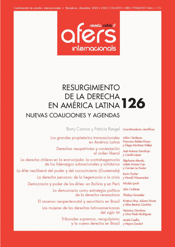 América Latina ha dado un giro a la derecha. Con la elección de Mauricio Macri como presidente de Argentina en 2015 y, sobre todo, de Jair Bolsonaro en Brasil en 2018, se inició un ciclo electoral en el que América Latina parecía haber dado la espalda a la «marea rosa» liderada por la izquierda que dominó la región desde el comienzo del milenio. El número 126 de Revista CIDOB d'Afers Internacionals busca analizar este fenómeno desde un enfoque integral del poder -que abarca las dimensiones ideológica, económica, militar y política-, así como sus influencias transnacionales, a partir de la siguiente pregunta clave: ¿Qué es nuevo y qué no en la actual generación de actores de la derecha en la región? Los artículos presentados proporcionan una imagen amplia de una derecha regional en transición, en la que muchos de los antiguos centros de poder siguen siendo prominentes (el ejército, por ejemplo, o la religión) pero con roles e identidades transformadas; y donde nuevos actores y medios de comunicación están redefiniendo la derecha latinoamericana del siglo XXI.