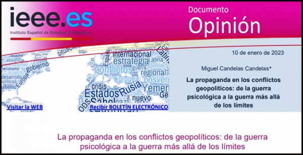 TextoSeries Documento OpiniónDetalles de publicación: Madrid : Instituto Español de Estudios Estratégicos , 2023Descripción: 16 pTema(s): Recursos en línea: Resumen: La propaganda, como elemento complementario de la violencia, siempre ha jugado un papel fundamental en el campo de la política y de la lucha por el poder. Por su parte, la guerra, como continuación de la política por otros medios, igualmente se ha servido del componente psicológico desde los albores de la humanidad, con el doble objetivo de desmoralizar a los enemigos, persuadir a los aliados y justificar el esfuerzo bélico ante la propia población. En la actualidad, los medios de comunicación de masas y las NTICS amplifican la propaganda y la guerra psicológica hasta cotas antes inimaginables, utilizando nuevas estrategias que van desde el "soft power" a las "fake news", pero con el único objetivo de seguir ocultando los intereses políticos y económicos de siempre bajo el hechizo de la persuasión. Además, las nuevas guerras más allá de los límites que están caracterizando a la competición geopolítica del siglo XXI, hacen todavía más real aquel verso del escritor británico Bulwer-Lytton: «La pluma es más poderosa que la espada».